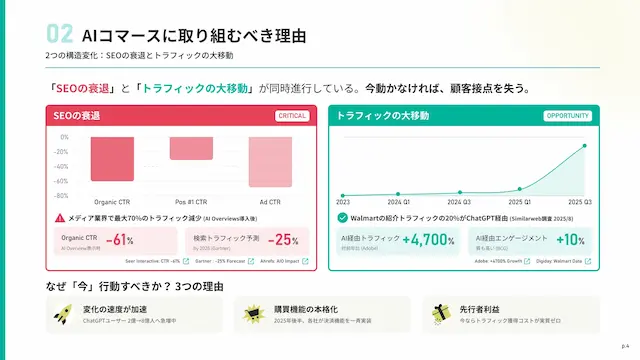 従来のSEO戦略だけでは、AI Overview表示時にオーガニックCTRが61%減少するなど、顧客接点の維持が困難になりつつあります。消費者行動の変化は不可逆的であり、EC事業者には「AIに選ばれる」ための新たな対策が急務となっています。