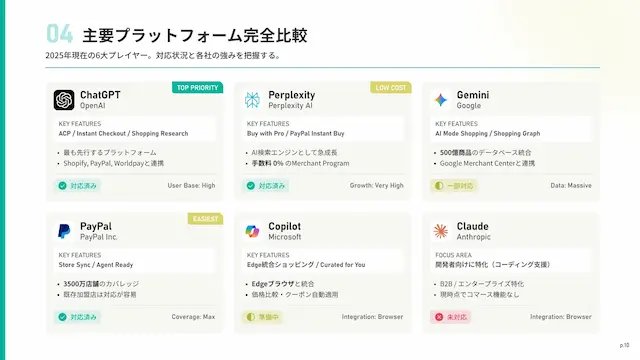 ChatGPT、Perplexity、Gemini、Copilot、PayPalの5大プラットフォームを徹底比較。各社の特徴、対応状況、戦略的な投資判断の指針を提供します。