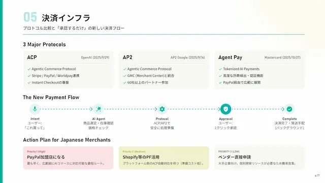 ACP(OpenAI)、AP2(Google)、Agent Pay(Mastercard)の3大プロトコルを解説。新しい決済フローと、日本のEC事業者向けアクションプランを示します。
