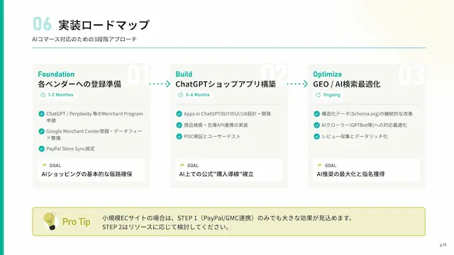 ACP/AP2プロトコルへの対応、構造化データ(Schema.org)の整備、各プラットフォームへの登録申請をサポートします。