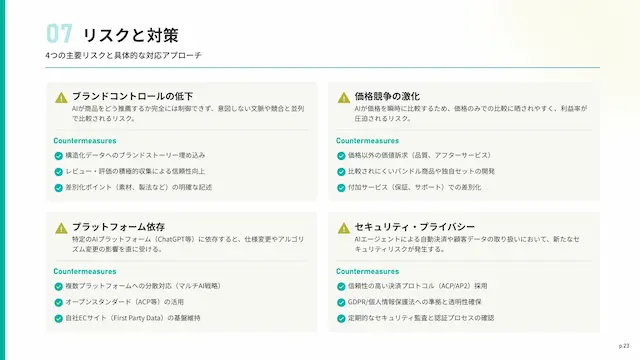 ブランドコントロールの低下、プラットフォーム依存、価格競争の激化、セキュリティの4つの主要リスクと、具体的な対応策を解説します。