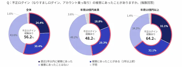 不正ログイン被害の経験率は2024年の54.8%から2025年は56.2%へと2ポイント増加しています。年商10億円以上の事業者では64.2%が被害を経験しており、企業規模が大きいほど被害が発生しやすい傾向が見られます。