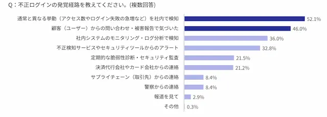 発覚経路として最も多かったのは、通常と異なる挙動から気づくケースで52.1%。次いで、顧客からの問い合わせで気づくケースが46.0%を占め、不正の兆候を事業者・顧客双方が察知している実態が明らかになりました。