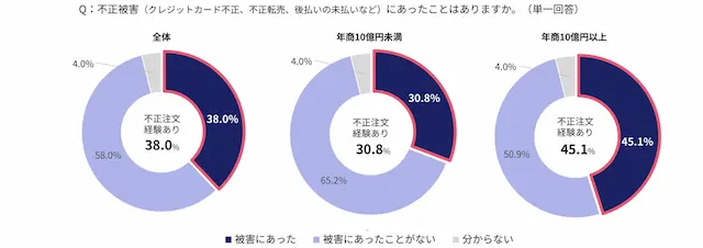 不正注文の被害経験率は38.0%で、2024年の41.8%からわずかに減少。年商10億円以上では45.1%、10億円未満では30.8%という結果が示され、大手ほど被害を受けやすいという傾向が見られます。被害種別ではクレジットカード不正利用が最も多く63.8%を占めています。
