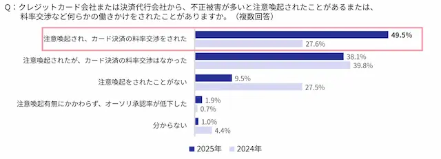 クレジットカードの不正利用被害が多いことを理由に、カード会社から決済手数料の料率交渉を受けた企業は、2024年の27.6%から2025年は49.5%へと大幅に増加しました。これは前年比21.9ポイント増となり、EC事業者の約半数が値上げ要請を受ける結果となっています。