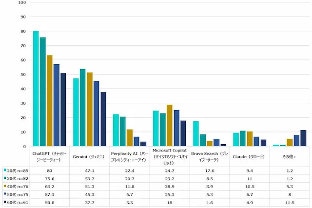 調べ物に占めるAI利用度は若年層ほど高く、検索の起点が「キーワード入力」から「AIへの質問」へ移行しつつあると言えるかもしれません。一方、中高年層は利用経験があるものの活用度は若年層に比べて若干浅く、AIへの依存度には年代差が残っています。