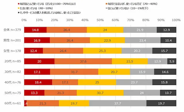他世代に比較して少ないとはいえ、60代でも約4割(42.6ポイント)のAI活用が確認されました。この年代が購入することが多い健康食品や化粧品などは情報量が多く、比較検討が必要な商材が多いことから、AIの要約・整理機能が高齢層にとっても有効に働いているといった可能性は否定できないでしょう。