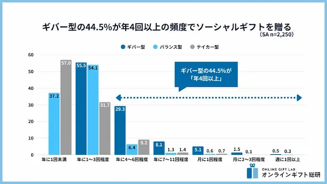 1. ギバー型の44.5%が年4回以上の頻度でソーシャルギフトを贈る