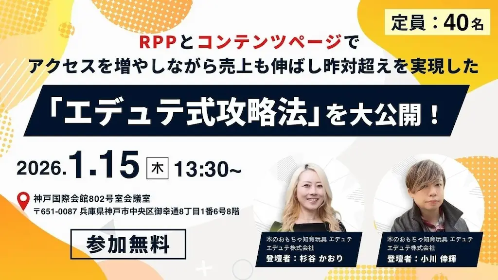 このイベントでは、木のおもちゃ専門店「エデュテ」の成功事例をもとに、RPPとコンテンツページを組み合わせた具体的な攻略法を大公開します。登壇者には、エデュテ株式会社の杉谷かおり氏と小川倖輝氏をお迎えし、レビュー投稿率2倍、転換率1.6倍アップを実現したリアルな施策や改善プロセスなど具体的な方法を解説します。