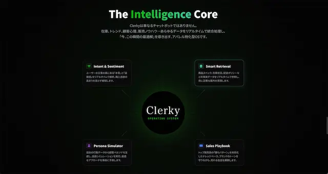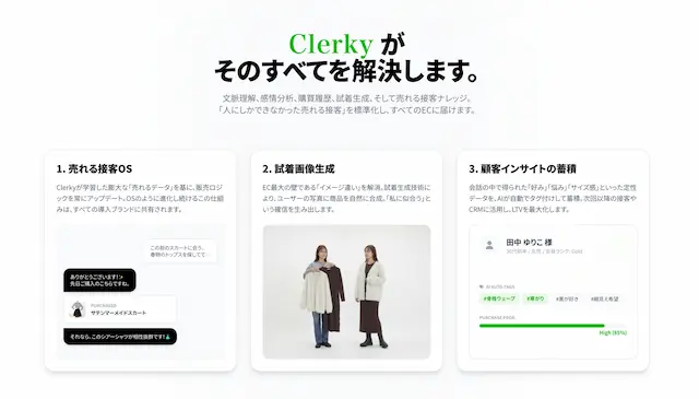 Clerkyは、文脈理解・感情分析・購買履歴・在庫情報・試着画像生成を統合し、「今、この瞬間の最適な一言」を導き出します。