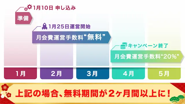 2026年1月1日〜2026年1月31日までにキャンペーンコードをご入力の上お申し込み頂いた方を対象に、運営開始から2026年3月末日分までの月会費の売上に対する運営手数料を無料とさせて頂きます。初期費用をかけずに開設することができる上、月会費の売上分については100%そのまま収入となるので、自分だけのサービスで売上を伸ばすなら今がチャンスです!