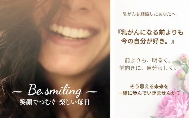 「Be.smiling」は、乳がんを体験した私(仲野香織)が病気をきっかけに出会った仲間と立ち上げた”気持ちを分かち合える仲間と、笑顔でつながる”オンラインサロンです。不安や孤独をひとりで抱え込んでいませんか?心がほっとできるコミュニティを目指しています。