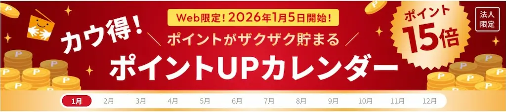 コクヨグループでEコマースサービスを提供する株式会社カウネット(本社:東京都港区/代表取締役社長:宮澤典友、以下「カウネット」)は、ECサイト「カウネット」において、お客様の計画的なお買い物をサポートする施策として、「カウ得!ポイントUPカレンダー」を公開し、2026年1月5日(月)より対象カテゴリのポイントが15倍となる特典を提供します。