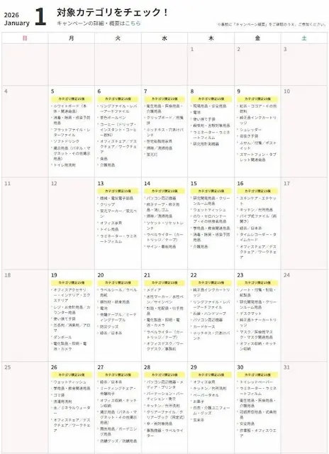 - 内容:数カ月ごとにカレンダー形式でお得な対象カテゴリを公開し、計画的な購買をサポートします。