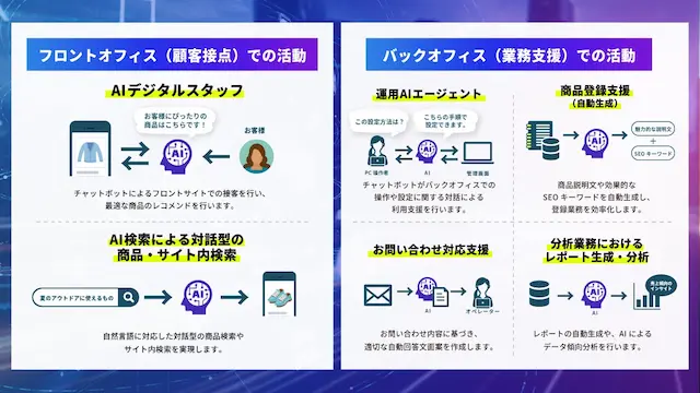 - デジサルAIサーチ: 「プレゼント用の赤いバッグ」など曖昧な検索に対し、対話形式で商品を提案。