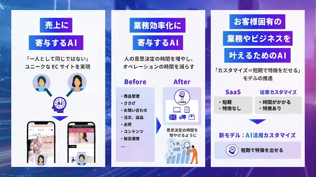 当社は「ecbeing AI+」を中核に、以下の3つの観点でAI実装を加速させ、お客様にとって唯一無二の「ビジネス成長エンジン」となることを目指します。