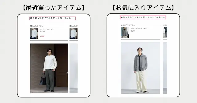 「購入した商品を使ったコーディネート」「お気に入り登録した商品を使ったコーディネート」といったおすすめを表示する機能を実装しました。これにより、購入履歴やユーザーの嗜好を踏まえた提案が可能となり、新たなアイテムを発見する機会を増やし、クロスセル拡大に貢献します。
