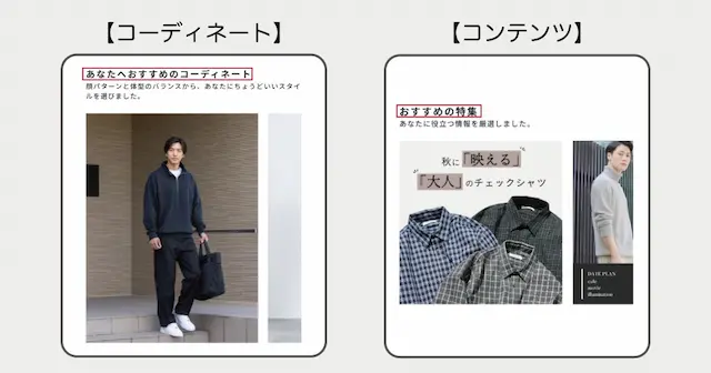 アプリ内に登録したユーザーの体型や顔パターンから「あなたへおすすめのコーディネート」「あなたにおすすめのコンテンツ」が表示されるようになりました。これにより、ユーザーの属性に応じて最適なコーディネートや特集情報が提供できるようになり、CVRの向上に貢献します。