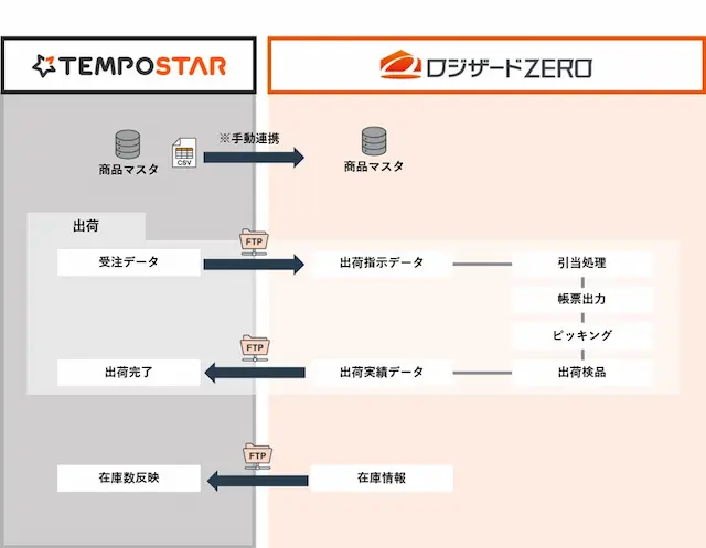 「TEMPOSTAR」と「ロジザードZERO」の自動連携により、注文情報・出荷実績・在庫数が自動で反映されるようになります。これにより、在庫の正確な把握・業務の効率化が可能となります。