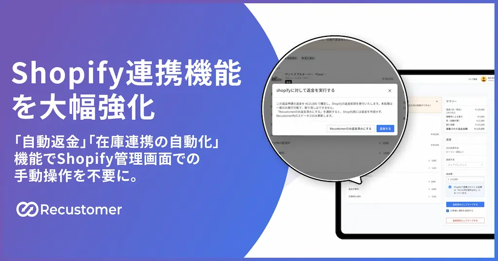 Recustomer株式会社(本社:東京都中央区、代表者:代表取締役 柴田 康弘、辻野 翔大)は、購入後体験プラットフォーム「Recustomer」において、Shopifyとの連携を強化する2つの新機能を正式リリースしたことをお知らせいたします。今回のアップデートにより、「Shopify経由での自動返金処理」および「返品完了時の自動ステータス同期・在庫戻し」が可能となりました。従来、RecustomerとShopifyの双方で行う必要があった手動操作を削減し、返品・返金対応におけるオペレーションコストの大幅な削減と、人為的ミスの防止を実現します。