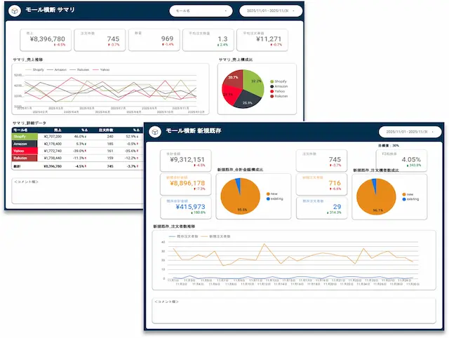 本ダッシュボードは、モールや自社ECなど、複数のECカートに分散している売上データを自動で集約し、チャネル横断、チャネル別、商品別などのさまざまな軸で集計・可視化します。