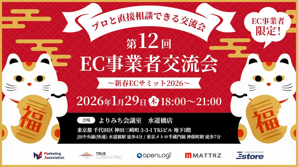 ECサイトの運営代行サービスを提供しているマーケティングアソシエーション株式会社(本社:東京都台東区 代表取締役:中園広和、以下当社)は、2026年1月29日(木)にリアルイベント「第12回 EC事業者交流会~新春ECサミット2026~ EC事業者限定!プロと直接相談できる交流会」を、トゥルーコンサルティング株式会社、株式会社Eストアー、Mattrz株式会社、株式会社オープンロジと共催いたします。