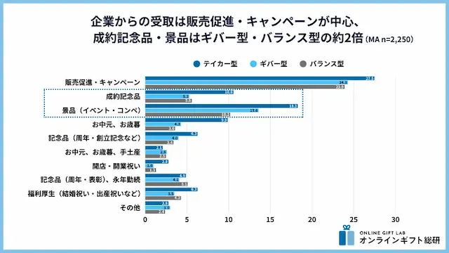 2. 企業からの受け取りは販売促進・キャンペーンが中心、景品・成約記念品はギバー型・バランス型の約2倍