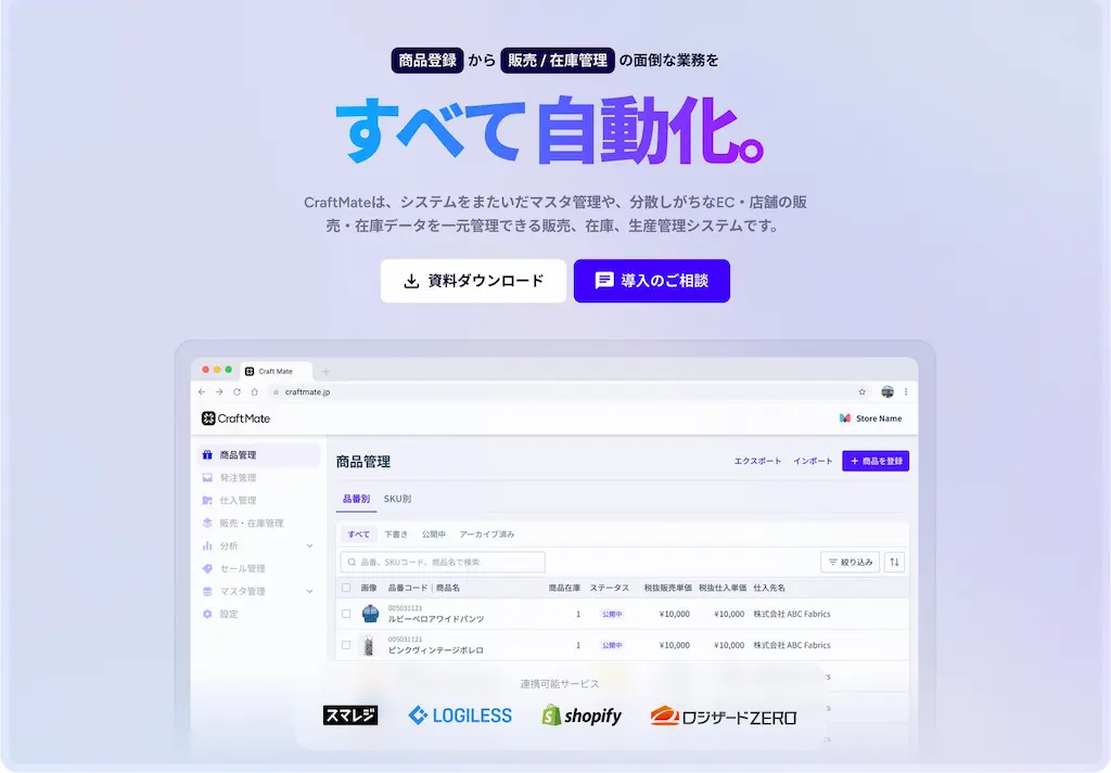 CraftMate(クラフトメイト)は、Shopify・スマレジ・ロジレスと直接連携し、アパレルブランドの基幹業務を一元管理できるクラウド型システムです。(アパレル以外の業態でもご利用いただけます)