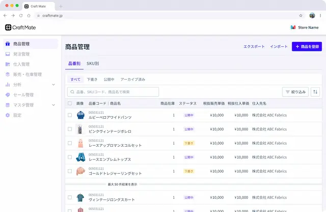 Shopify(EC)、スマレジ(POS)、ロジレス(OMS・WMS)をすでに導入しているアパレルブランド向けに、それらを横断して管理できるクラウド型基幹システム「CraftMate(クラフトメイト)」を本格提供開始しました。