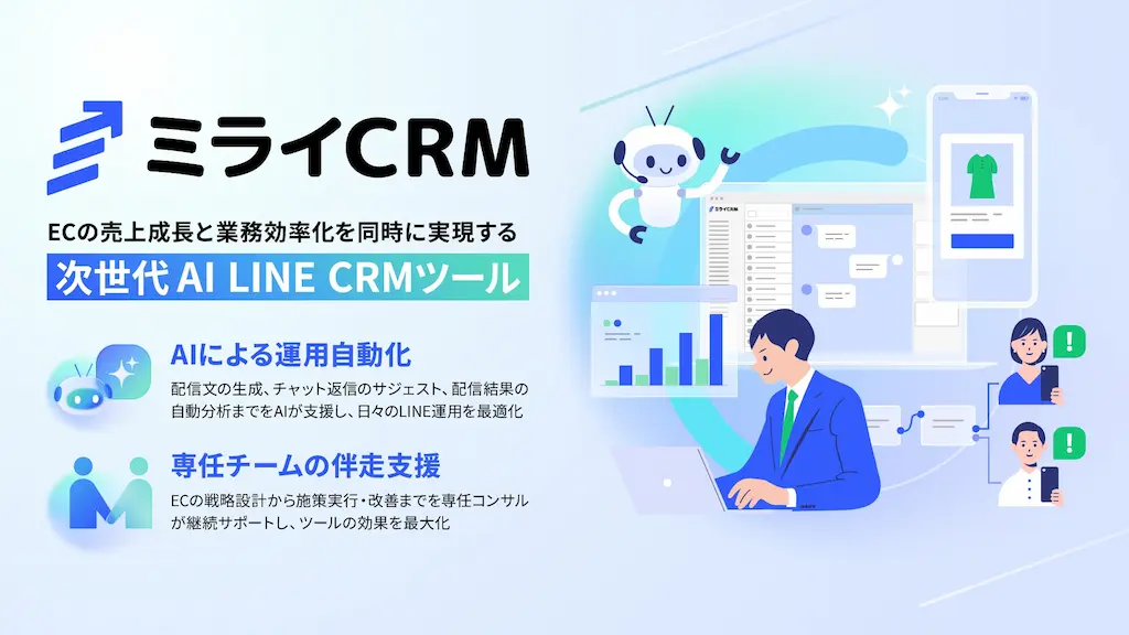 株式会社ミライCRM(本社:東京都渋谷区、代表取締役:高木一樹)は、AIでECの売上成長と業務効率化を同時に実現するLINE CRMツール「ミライCRM」を正式リリースしたことをお知らせいたします。