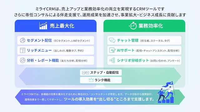 近年、EC市場の拡大とともに、企業には単なる購買促進にとどまらず、顧客と継続的な関係を築く高度なCRMが求められています。一方で、LINE運用や顧客データ活用は属人化・複雑化し、多くの事業者が十分に活用しきれていないという課題も存在しています。ミライCRMは、こうした課題に対し、AIによる業務の自動化と、戦略設計から実行までを支援する仕組みとして開発されました。EC事業者のLINE運用における配信設計・顧客対応・データ分析など、煩雑で属人化しがちな業務をAIで自動化し、成果につながるコミュニケーションを実現します。またECの購買データやLINEの行動データを連携させることで、セグメント配信やステップ配信、リッチメニューの出し分けなどを効率的に実施でき、売上向上と運用負荷軽減の両立を可能にします。