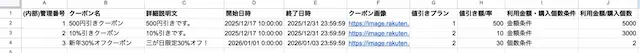 下記のブログ記事にて、Google スプレッドシートと組み合わせたクーポン一括発行の事例を解説しております。