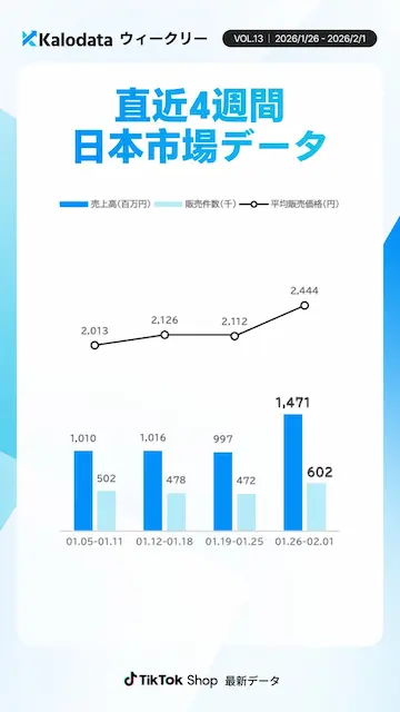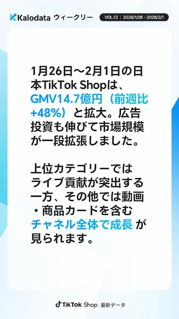 Kalodata Japan(運営:株式会社Kalowave Japan)の最新データ分析によると、2026年1月26日〜2月1日の日本TikTok Shop市場は、GMV14.7億円(前週比+48%)と大幅に拡大しました。販売件数・平均単価・広告投資が同時に伸長し、市場規模そのものが一段引き上げられています。動画本数は横ばい推移となった一方、ライブ配信者数は増加し、売上成長は上位カテゴリーにおけるライブ主導の拡大と、その他カテゴリーにおける動画・商品カード経由の積み上げが並行して進む構図が確認されました。