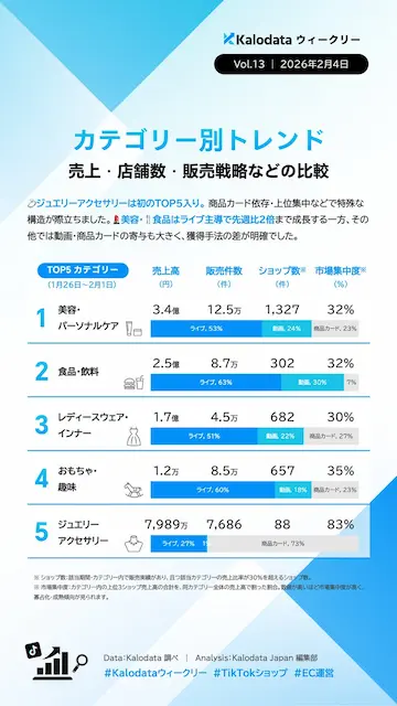 カテゴリー別では、ジュエリーアクセサリーが初めてTOP5入りし、商品カード経由が売上の73%を占め、上位3店舗に83%が集中するなど、特定構造への依存が際立ちました。一方で、美容・パーソナルケアおよび食品・飲料はライブ経由売上が前週比で大きく伸長し、GMVの倍増を果たしました。その他カテゴリーでは動画・商品カード経由の寄与が相対的に大きく、カテゴリーごとに有効な獲得チャネルが分化する傾向がより明確となっています。