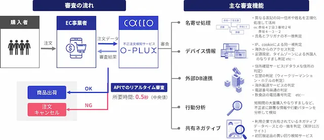 Caccoが提供する不正検知サービス「O-PLUX」は、ECで発生する不正ログインや不正注文をリアルタイムで検知し、個人情報漏洩やクレジットカードの不正利用、悪質転売などの不正被害の防止及び審査業務の自動化を実現するクラウドサービスです。