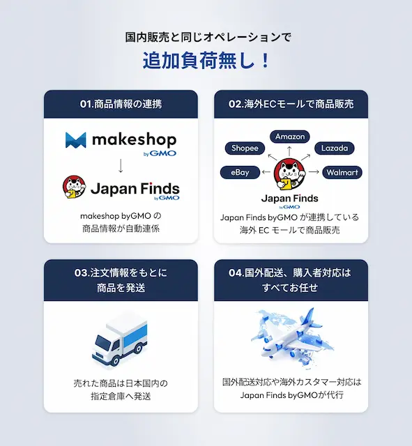 「Japan Finds by GMO」は、eBayをはじめとした海外主要ECモールに対し、自社ECサイトで扱う商品を出品できる越境EC支援サービスです。商品情報の登録、多言語翻訳、決済処理、受注管理、国際配送までをワンストップで提供し、海外販売に必要な煩雑な工程を包括的に支援します。「makeshop by GMO」を利用するEC事業者は、「申し込み・審査」→「商品連携」→「注文情報をもとに国内倉庫に商品を納品」の3ステップで海外販売を開始でき、面倒な輸出手続きや海外顧客対応はすべて本サービスが代行します。
