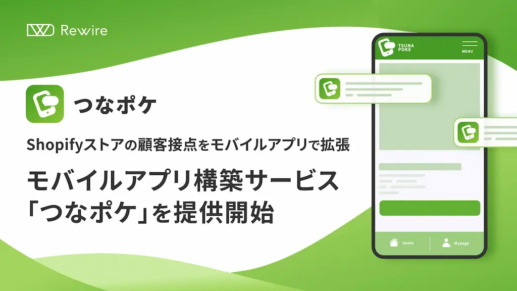 株式会社リワイア(所在地:東京都港区、代表取締役:加藤 英也、以下「リワイア」)は、グローバルコマースをリードするShopify(ショッピファイ)のオンラインストアを基盤としたモバイルアプリ構築サービス「つなポケ」の提供を開始しました。「つなポケ」は、Shopifyの顧客データや顧客セグメントを活用し、小売事業者が顧客の手元へ最適なタイミングでプッシュ通知で直接情報を届けるモバイルアプリを構築できるサービスです。