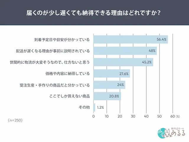 「届くのが少し遅くても仕方ないと感じたことがあるか」を尋ねたところ、約75.6%が「遅さを許容した経験がある」と回答しました。