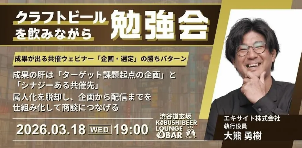 渋谷のマーケター&起業家コミュニティを運営するKOBUSHI MARKETING合同会社(東京都渋谷区、代表:井上裕介)は、2026年3月18日(水)19:00~ゲストにエキサイトの大熊執行役員を迎え、成果が出る共催ウェビナーの仕組みについて解説するマーケティング勉強会を開催すると発表しました。