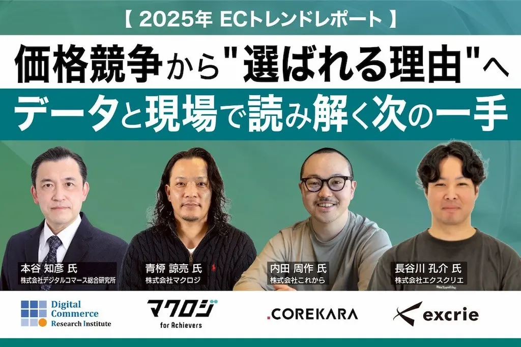 このような状況を受け、株式会社エクスクリエが主催し、累計2万件以上のEC支援実績を持つ株式会社これから(本社:東京都新宿区、代表取締役:今泉 雄介)をはじめ、株式会社デジタルコマース総合研究所、株式会社マクロジが知見提供として参画しました。4社それぞれの強みと実務データをもとに、ホワイトペーパー『【2025年 ECトレンドレポート】価格競争から“選ばれる理由”へ ― データと現場で読み解く次の一手』を無料公開しました。