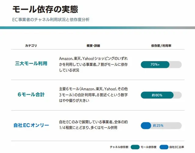 近年、EC市場では値引きやポイント還元による価格勝負が激しさを増しています。多くの事業者がモールECに売上の大半を占める中、今後もモールと自社ECの併用が主流となる見通しですが、ここで課題となるのが「モールプラットフォームへの依存」です。