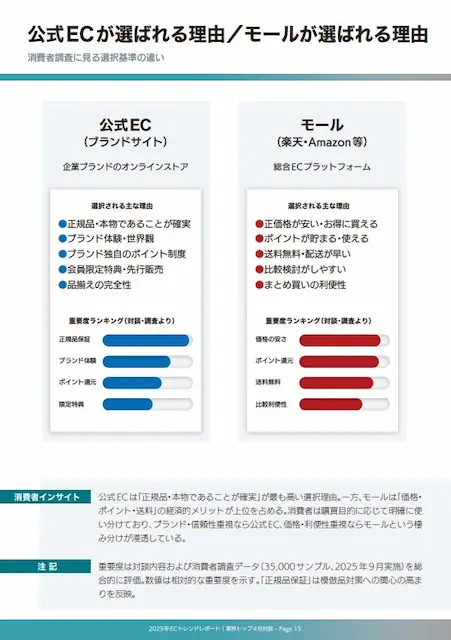本資料では、価格依存が進む現在のEC市場を背景に、モールECと自社ECの最適な役割分担と、モールECと自社ECに対して消費者が求めているポイントを徹底解説しています。