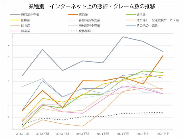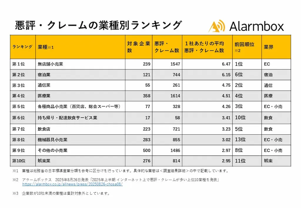 2025年8月26日発表「2025年上半期 インターネット上で悪評・クレームが多い上位10業種を発表」https://alarmbox.co.jp/allnews/press/20250826-chosa08
