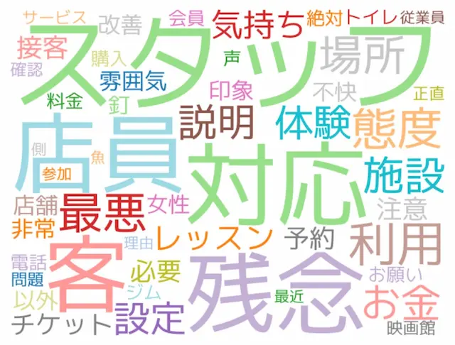 あわせて、フロントやスタッフの対応に触れた投稿も多く、接客時の印象や説明の受け取り方が評価に影響している様子がうかがえます。クレームでの頻出単語を見ても、「部屋」「スタッフ」「対応」「残念」「利用」などの語が多く出現しており、宿泊体験全体に関わる内容が幅広く投稿されていることが分かります。