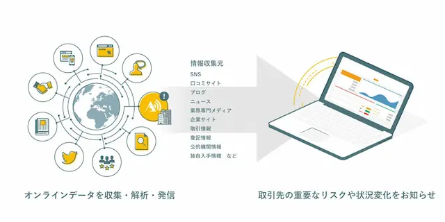 AI与信管理クラウドサービス「アラームボックス」(https://alarmbox.jp)は、企業や自治体のHPに掲載された情報や、SNSや口コミなどインターネット上で投稿された情報をAI技術で収集・解析し、提供するクラウドサービスです。新規取引時の与信判断、既存取引先の継続的な与信管理、さらに売掛保証までを一括して行うことができます。収集・判断の難しいネット上の情報を、与信への影響度を診断したうえで提供するため、インターネット上の情報を活用した高精度な与信管理を、簡単に、低価格で導入できます。それにより、取引先の情報収集に関わる業務負荷を大幅に削減し、スマートフォンやPCから取引先を登録しておくだけで、迅速にリスクに対応できます。