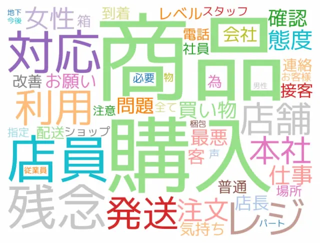 加えて、問い合わせへの対応や、返品・交換・キャンセル時の対応を巡る不満も多く、クレームでの頻出単語を見ても「購入」「商品」「発送」「連絡」「対応」といった言葉が目立ちます。購入から発送までの進捗や対応方針を適切に伝えることが、不要な悪評・クレームの抑制につながるといえます。