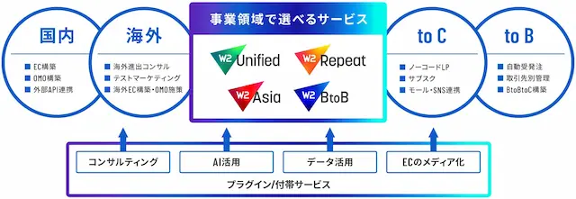 W2は、“事業領域で選べるECプラットフォーム”として、ビジネスの多様な成長ステージに対応する4つのソリューションを提供しています。