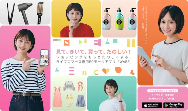 「WABE」は「見て(Watch)、きいて(Ask)、買って(Buy)、たのしい(Enjoy)」をコンセプトにしたライブコマース専用のECモールアプリです。販売事業者であるメーカー・ブランドやライブコマーサーと消費者を繋ぐライブコマースプラットフォームです。