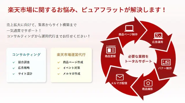 株式会社ピュアフラットは、EC事業に特化したマーケティング会社として、集客からサイト構築・広告運用・CRM設計までを一気通貫で支援しています。短期施策ではなく、中長期で売上が積み上がるEC事業づくりを強みとしています。