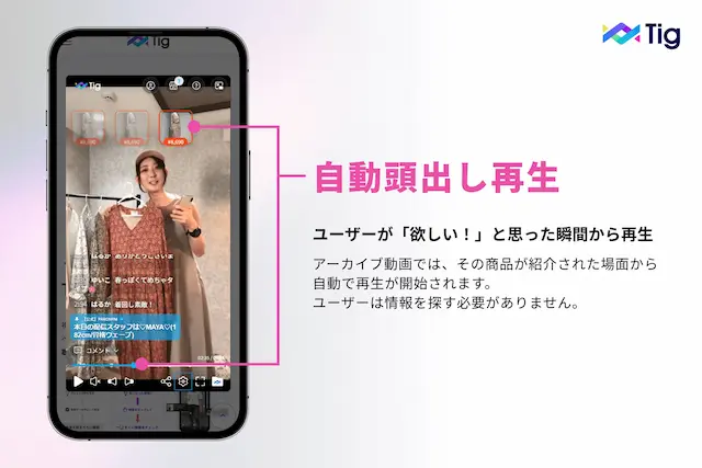 - 自動頭出し再生:アーカイブ動画では、その商品が紹介された場面から”自動で頭出し再生”が開始されます。
